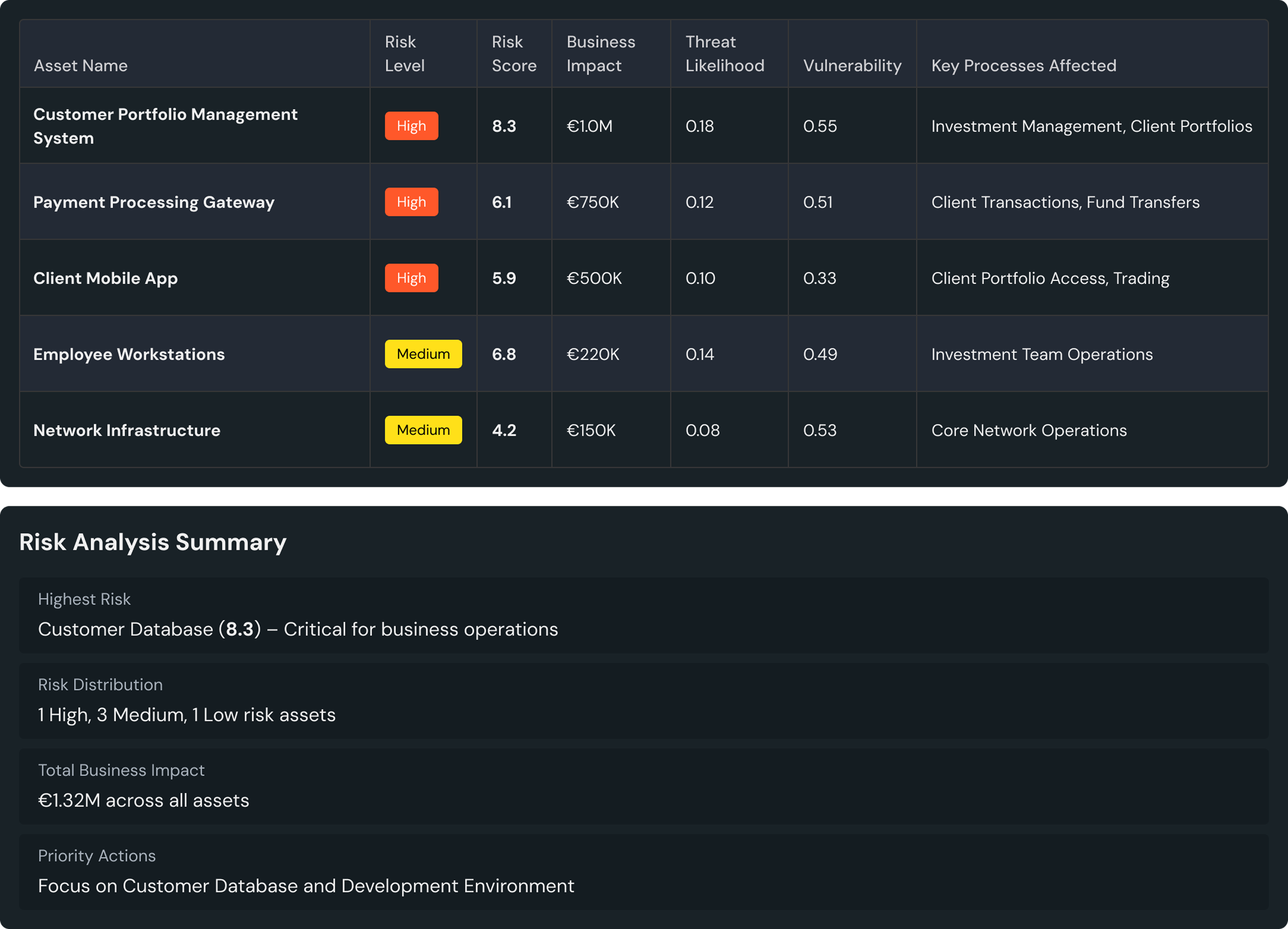 Get a complete view of all critical assets, their risk levels, and progress — no more switching between spreadsheets or tools.